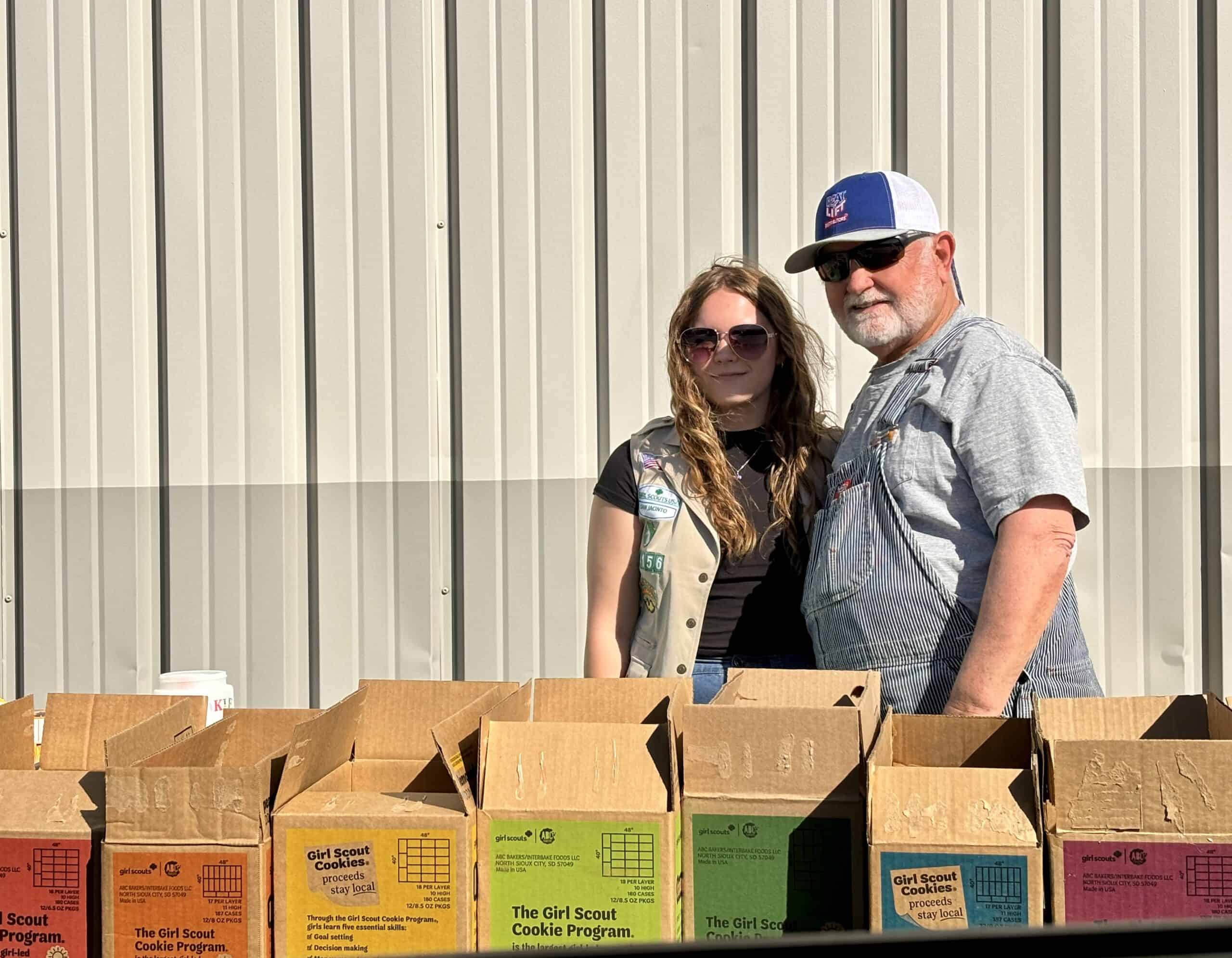 It’s Girl Scout Cookie time in Houston County, as the young ladies will be tempting you with their traditional cookie sale. Here, Girl Scout Jade Olsen and grandfather Jim Stout enjoy the sun and warm weather with their well-stocked stand in Crockett.